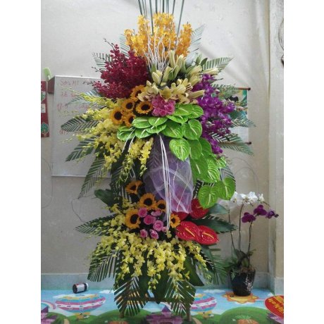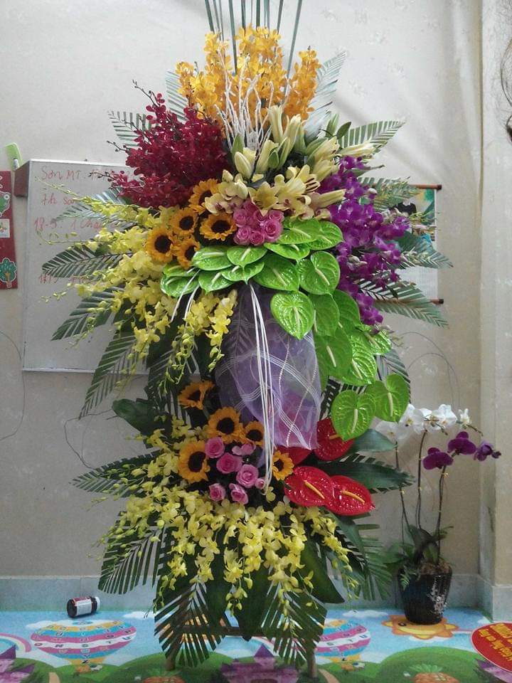 - Lẵng hoa thiết kế với các gam màu trầm và nóng, tinh tế và không kém phần sang trọng của các loài hoa kết hợp.