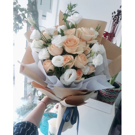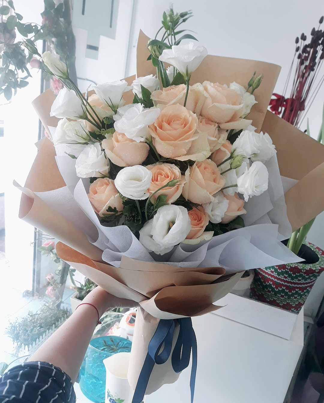 - HOA HỒNG HỘT GÀ mang ý nghĩa của sự thanh nhã và sang trọng cũng như sự ngọt ngào và lãng mạn trữ tình, được phối cùng hoa CÁT TƯỜNG TRẮNG, thể hiện sự nhẹ nhàng và sự ngưỡng mộ. Như sự dịu dàng và ấm áp của tình mẹ . Bó hoa được sử dụng như một cách bày tỏ tình yêu thương với Mẹ bạn đang sinh thành và chăm sóc bạn