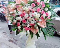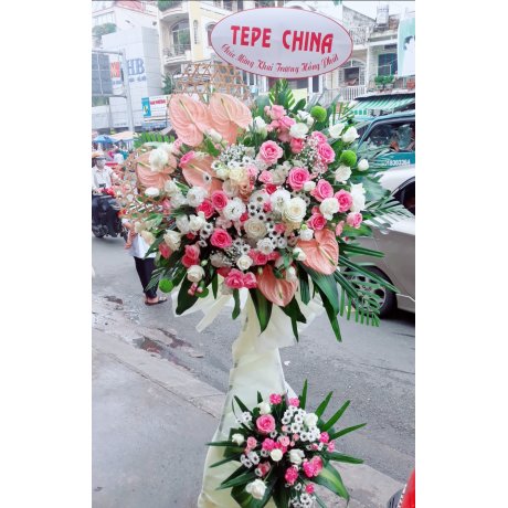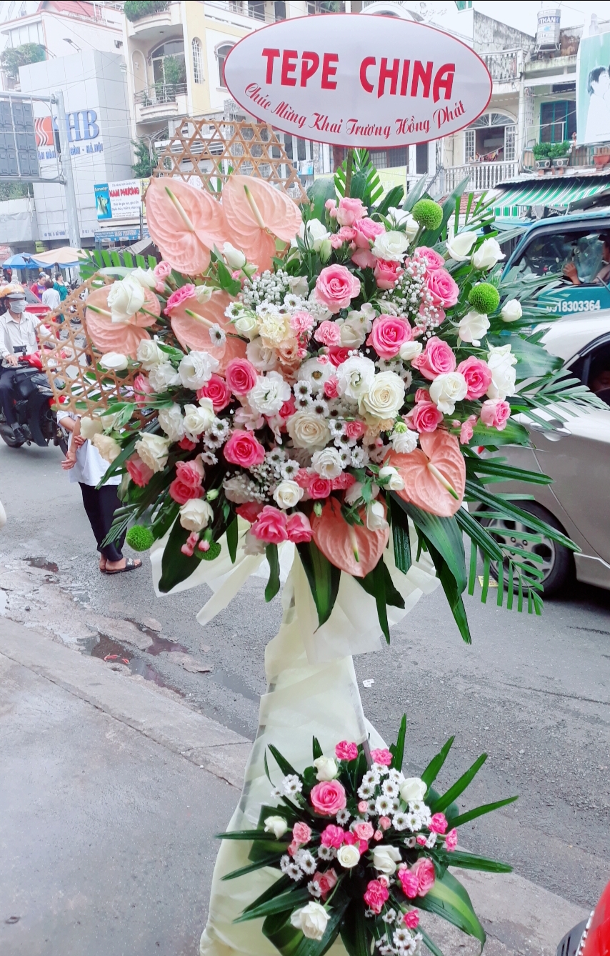 Mẫu hoa là sự kết hợp những tông màu tươi tắn như chính ngành nghề đối tác kinh doanh, lẵng hoa như lời chúc quý mến và tin tưởng thành công.
