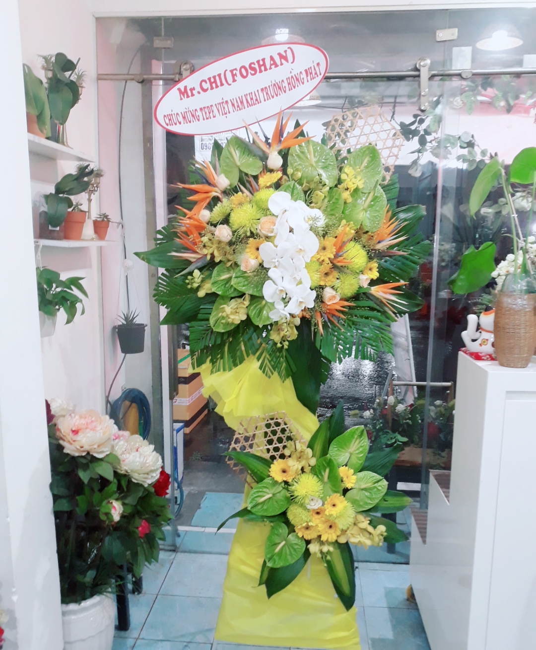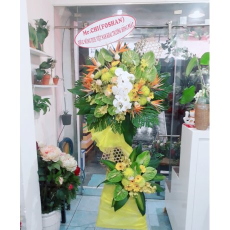 Như một lời chúc hoàn hảo dành cho đối tác trong ngày mở đầu kinh doanh, những cánh chim thiên điểu mong muốn quý đối tác vươn thật cao, thật xa trên thương trường, nhánh hoa lan sang trọng quý phái, kết hợp cùng màu vàng dịu của hoa bách hợp.