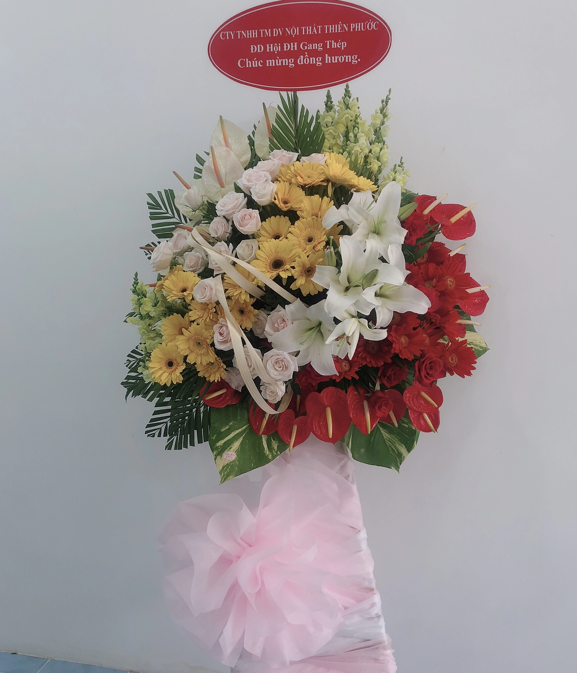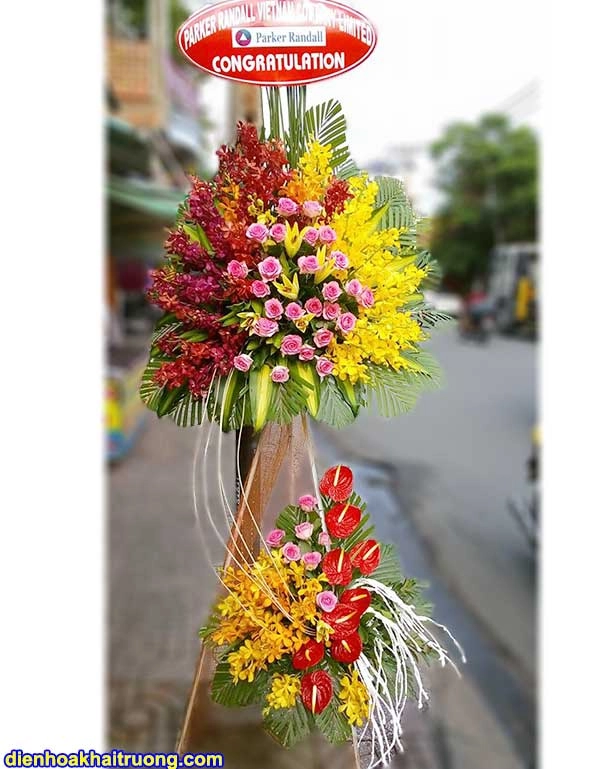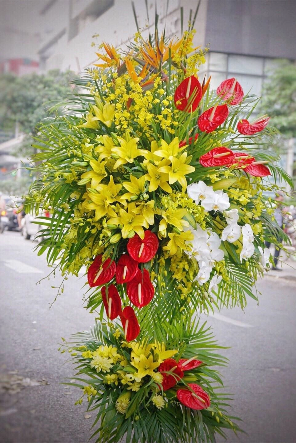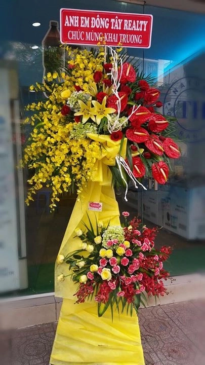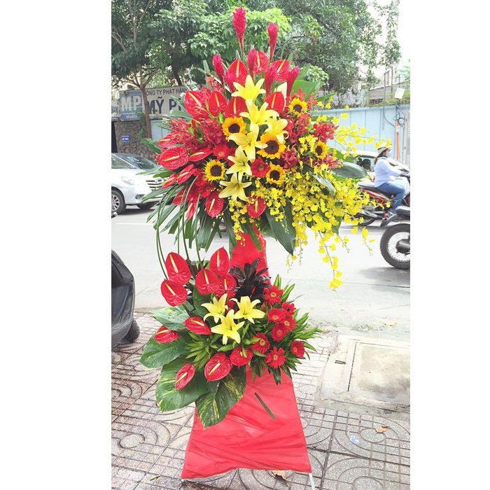 - Hãy cùng nhau cầu chúc cho công việc của những người bạn yêu quý luôn thuận lợi và luôn vươn tới đỉnh cao thành công. Với kệ hoa tone màu đỏ và vàng sẽ thay bạn gửi lời chúc tốt đẹp nhất đến cho công việc của họ. Thích hợp tặng dịp khai trương, kỉ niệm thành lập