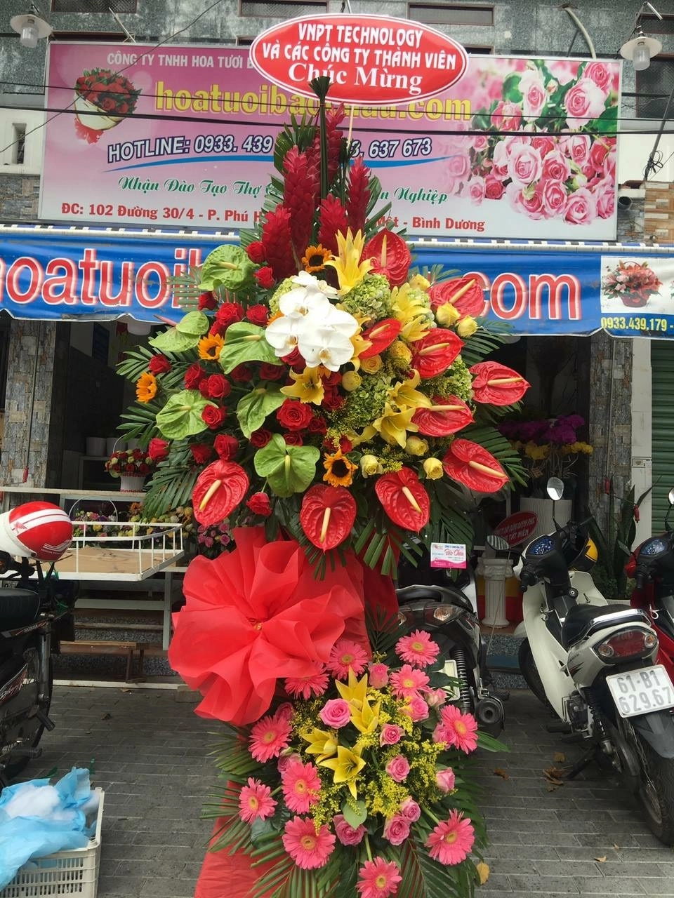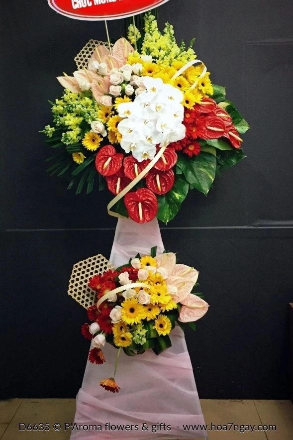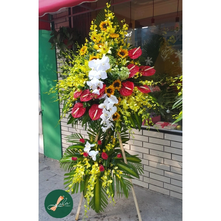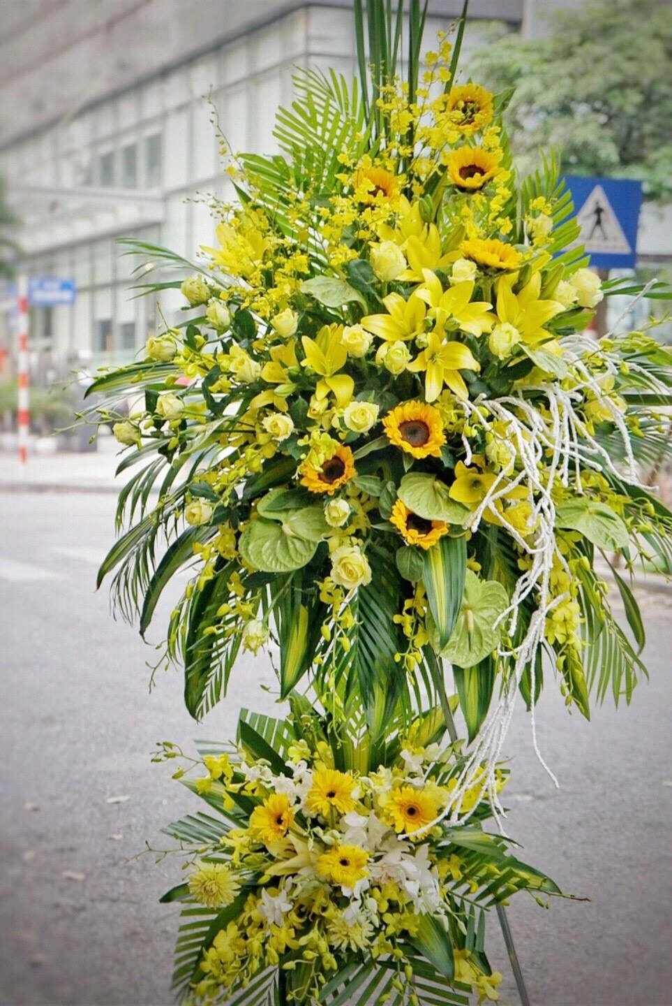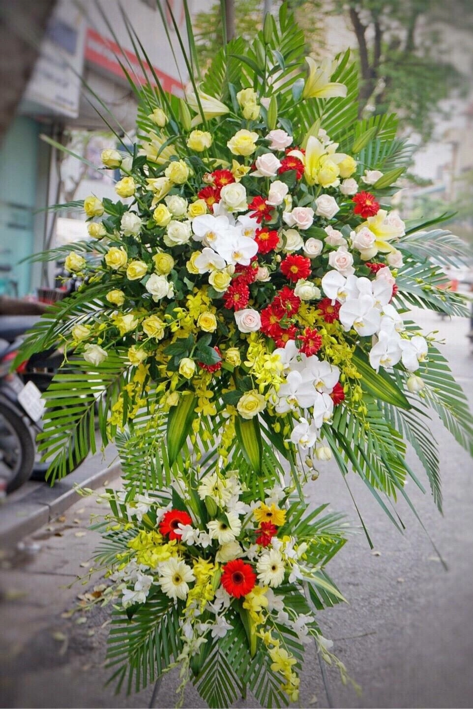- Hãy cùng nhau cầu chúc cho công việc của những người bạn yêu quý luôn thuận lợi và luôn vươn tới đỉnh cao thành công. Với kệ hoa tone màu đỏ và vàng sẽ thay bạn gửi lời chúc tốt đẹp nhất đến cho công việc của họ. Thích hợp tặng dịp khai trương, kỉ niệm thành lập